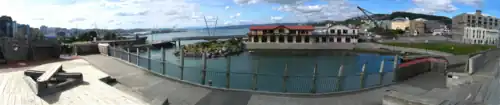 Whairepo Lagoon is an open public area at the centre of Wellington, New Zealand. It is a small man-made lagoon filled with sea water and connected to Wellington Harbour through a narrow channel. A split-level footbridge over the mouth of the lagoon was designed by Eastbridge.[1] The lagoon is surrounded by The Boat Shed, City-to-Sea bridge, and the Wellington Rowing, Star Boating Club, and Te Raukura buildings. Tanya Ashken's Albatross fountain sits on the north side of the lagoon between it and Frank Kitts Park.