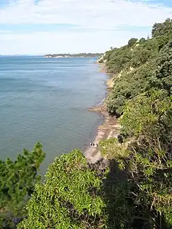 The seaward side of the tuff crater is falling away down the coastal cliffs to 'Gentleman's Bay' far below. The tuff ring is made from ash and ejected material. The cliffs were there before the volcano erupted so the volcanic rock draped over the clay hill that once existed before sea levels rose and began eroding it away to become the steep cliffs we see today. Some volcanic rocks can be found on the beach below – some fragments ejected from deep in the earth, or blocks of tuff ring that were once perched on top of the cliff. Rangitoto Island is directly to the north, however Rangitoto is a recent eruption (600 to 550 years ago)[3] and was not always there to shelter the cliffs from powerful wave action. There is an old concrete water tower built on the tuff ring formed around the edge of the crater opposite the seaward side.