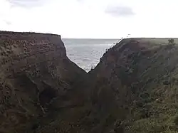 Its name probably originates from the Wavell family, owners of the nearby Atherfield Farm between 1557 and 1636.[1] It is reached from a car park on the A3055 coastal road, where a stream running parallel to the cliff takes a right-angled bend to descend to the beach.[2] In the past, descent to the beach at Whale Chine could be achieved by some 126 wooden steps, since their closure in 2005, these steps were washed away by the sea in the winter storms of 2013/14. As the beach is a popular fishing site, Local fisherman have constructed a new flight of stairs by carving steps down through the rock, although this is not recommended. Despite the old steps forming part of a footpath and legal Right of Way (footpath C34, Chale Parish), the Isle of Wight Council refused to repair them, stating that "major structural works at great expense would be required to make the path safe for use with no guarantee that such works would be a permanent solution." They have been inaccessible to the public since at least 2005 and subject to a "temporary closure" since then.