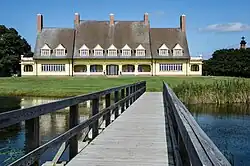 In 1920, Edward Collings Knight, Jr., heir to a fortune made in sugar, railroads, and steamships, purchased the land with longtime companion and second wife Marie-Louise LaBel Knight. The Knights named their new residence after its location outside the village of Corolla.[2] Built in an isolated area of the Currituck Outer Banks, the house sits along the Currituck Sound connecting to the Atlantic Flyway.[3] Renowned for teeming flocks of waterfowl, there were many other public resources within the neighboring village to Corolla Island. Currituck Beach Life Saving Station offered a vital link to the outside world through telegraph. Alongside, Corolla village provided a postal service, general store, as well as a Baptist church, and local school.[1] The Knights constructed Corolla Island on the Property of the Lighthouse Club, a well-known shooting club purchased by Mr. Knight. Though frequented guests avidly hunted waterfowl, Corolla Island served not as a club but a comfortable retreat for a hospitable couple and their many friends.[2] Construction of the house began in 1922 and was completed in 1925. Norfolk building contractor John Kelbaugh orchestrated the logistics of building 20 rooms, contained within three stories. A six-foot-deep dredged channel was hand dug on the western edge, thus forming of it an Island.[1] Among the many items the Knights brought over, the more luxurious furnishings were the custom-made Tiffany lamping in a water-lily design, as well as Louis Majorelle furniture. Corolla Island housed the Knights for nine seasons. After the couple's death in 1936, the heirs, Mr. Knights two granddaughters, sold the $348,000 estate for $25,000 and married into wealth in France.[3] The home was used for many purposes after the Knights deaths. During the WWII era the home became an active Coast Guard recruitment base. In 1959, '60 and '61, the home and adjoining acreage were used by Corolla Academy as a private boys' summer school, offering credit and remedial courses for Grades 7 through 12. After that—one source says in 1964—the property was bought by the Atlantic Research Corporation and used a testing site for rocket fuel. After over 20 years of abandonment the house was bought by Currituck County in 1992 to be restored back to its original state. Today, the house is fully restored and now acts as a historic home for the public.[1]
