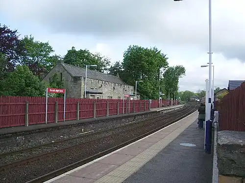 Whalley railway station serves the village of Whalley in Lancashire, England. The station lies on the Ribble Valley Line 7+1⁄4 miles (11.7 km) north of Blackburn. The station has two platforms, slightly offset from each other. It is unstaffed, with shelters on each platform.[1] Immediately beyond its eastern end, the line crosses the River Calder on a 678-yard (620 m) long, brick viaduct of 48 arches.[2]
