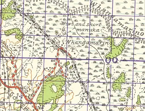 ![]() 1942 Whangamarino railway station on N52 one inch map | |||||