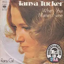 "What's Your Mama's Name" is a song written by Dallas Frazier and Earl Montgomery, and recorded by American country music artist Tanya Tucker. It was released in February 1973 as the first single and title track from the album What's Your Mama's Name. The song was Tucker's fourth hit on the country chart and her first number one. The single stayed at number one for a single week and spent a total of fourteen weeks on the chart.[1] On the Billboard Hot 100 pop chart, it reached number eighty-six. Tammy Wynette also recorded an unreleased version of the song in the early 1970s. Her version was never officially released till after her death in 1998.