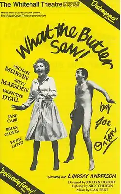 What the Butler Saw is a two-act farce written by the English playwright Joe Orton. He began work on the play in 1966 and completed it in July 1967, one month before his death.[1] It opened at the Queen's Theatre in London on 5 March 1969. Orton's final play, it was the second to be performed after his death, following Funeral Games in 1968.