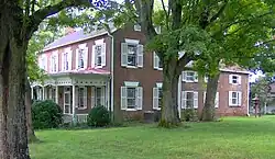 Original structures at Wheatlands include the mansion house (rebuilt around 1825 after a fire), a smokehouse, the summer kitchen with dining hall, and loom house. A second storage shed and barn have been added more recently. The distillery burned in the late 1930s. The original house, made of clapboard with a large front porch, burned in 1824, and was rebuilt in 1825. Wheatlands is a 2-story, 5-bay brick house with a 1.5-story kitchen and dining room wing attached to the rear to form an "L" shape. The house is designed in the Federal style, although a Queen Anne-style front porch was added as well as Queen Anne Windows in 1889. The brickwork on the house's front facade uses a Flemish bond, and the brickwork on the sides and rear uses common bond. A brick cornice encircles the house.[2]