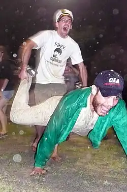 A wheelbarrow race is a competitive game in which teams of two players race with one teammate playing the role of the driver, and the other playing the role of the wheelbarrow. The driver holds on to the other player's ankles, while the other player walks with their hands.[1][2][3][4]