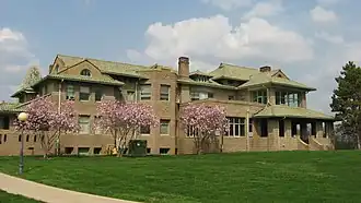 Wheeler–Stokely Mansion, also known as Hawkeye, Magnolia Farm, and Stokely Music Hall, is a historic home located at Indianapolis, Marion County, Indiana. It was built in 1912, and is a large 2+1⁄2-story, asymmetrically massed, Arts and Crafts style buff brick mansion. The house is ornamented with bands of ceramic tile and has a tile roof. It features a 1+1⁄2-story arcaded porch, porte cochere, and porch with second story sunroom / sleeping porch. Also on the property are the contributing gate house, 320-foot-long colonnade, gazebo, teahouse, gardener's house, dog walk, and landscaped property.[2]: 5–7