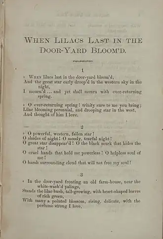 "When Lilacs Last in the Dooryard Bloom'd" is a long poem written by American poet Walt Whitman (1819–1892) as an elegy to President Abraham Lincoln. It was written in the summer of 1865 during a period of profound national mourning in the aftermath of the president's assassination on 14 April of that year.
