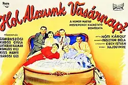 Where Do We Sleep on Sunday? (Hungarian: Hol alszunk vasárnap?) is a 1937 Hungarian comedy film directed by Béla Pásztor and starring Ella Gombaszögi, Gyula Kabos and Kálmán Latabár.[1] [2] It was shot at the Hunnia Studios in Budapest. The film's sets were designed by the art director Márton Vincze.