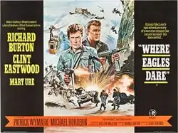 Where Eagles Dare is a 1968 action adventure war film directed by Brian G. Hutton and starring Richard Burton, Clint Eastwood and Mary Ure. Set during World War II, it follows a Special Operations Executive team charged with saving a captured American General from the fictional Schloß Adler fortress, except the mission turns out not to be as it seems. It was filmed in Panavision using the Metrocolor process, and was distributed by Metro-Goldwyn-Mayer. Alistair MacLean wrote the screenplay, his first, at the same time that he wrote the novel of the same name. Both became commercial successes.