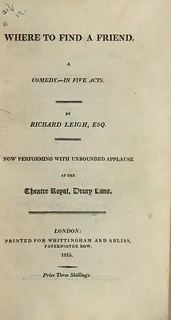 Where to Find a Friend is a comedy play by the British writer Richard Leigh.[1] It premiered on 20 May 1811 at the Lyceum Theatre in London, which was being used the Drury Lane company while their own theatre was being rebuilt after a fire.[2] The original cast included Henry John Wallack as Sir Harry Morden, George Bartley as General Torrington, William Dowton as Heartly, Edward Knight as Jack Bustle, John Henry Johnstone as Barny, William Oxberry as Timothy Scamp, Joseph Ebsworth as Servant to General, Maria Rebecca Davison as Lady Morden, Frances Maria Kelly as Maria and Sarah Sparks as Mrs Bustle. It was Leigh's second play performed by the Drury Lane company following Grieving's a Folly in 1809.