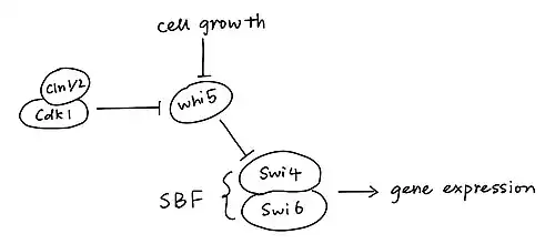 SBFs (SCB binding factors) are transcription factors that bind to SCB promoter regions, which control the expression of G1-specific proteins, and signal the transition from G1 to S phase.[1] SBF are heterodimers, which contain a DNA-binding unit (Swi4) and a regulatory sub-unit (Swi6).[3] Therefore, activation of SBF will result in the transcription of G1-specific genes. Hypo-phosphorylated Whi5 is stably bound to the SCB promoters via SBF in early G1 phase and suppresses downstream transcription. In the late G1 phase, Whi5 would be hyper-phosphorylated by Cln1/2-Cdk complex, resulting in the dissociation of Whi5 with SBF and exporting Whi5 from the nuclease,[4] releasing the transcriptional inhibition and progressing into G1/S transition.