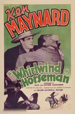 Whirlwind Horseman is a 1938 American Western film directed by Robert F. Hill and written by George H. Plympton. The film stars Ken Maynard, Joan Barclay, Billy Griffith, Kenneth Harlan, Joseph W. Girard and Kenny Dix. The film was released on April 29, 1938, by Grand National Films Inc.[1][2][3]