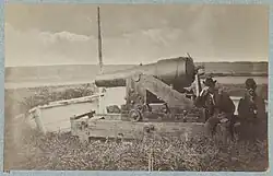 Confederate officers Edward Higgins and Samuel H. Lockett produced writings that identified Whistling Dick as an 18-pounder rifled cannon.[4] Bearss notes the writings of Higgins and Lockett, as well as those of Confederate artilleryman A. L. Slack, and concludes that the true Whistling Dick was an 18-pounder rifled gun.[7] Historian Warren Ripley refers to the identity as an 18-pounder as plausible.[4] Slack had written in a newspaper article in 1900 that the gun had originally been a smoothbore before rifling was later applied to it and that its breech had been strengthened with banding.[8] Ripley considers Slack's description to be probably accurate, although he also notes that the amount of time between the siege and the article means that the account may be in error on some points. In particular, he states that the claim of banding cannot be proven without locating the actual cannon. Ripley summarizes the available evidence as indicating that Whistling Dick was a rifled 18-pounder with breech banding. He further identifies the gun as most likely a Model 1839 cannon.[9] Historian Kevin Dougherty accepts the identification as an 18-pounder converted smoothbore rifle with breech banding.[3] A Model 1839 18-pounder gun would have been largely obsolete by the time of the siege.[10][3] Slack wrote that Whistling Dick, "for a heavy siege gun, was of rather modest proportions".[8]