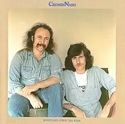 Whistling Down the Wire is the third album by Crosby & Nash, released on ABC Records in 1976, the second of the duo's three-album deal with ABC Records. Cassette and 8-track tape versions of the album were distributed by Atlantic Records, to which Crosby, Stills, Nash & Young were signed. It peaked at No. 26 on the Billboard 200 album chart and was certified gold by the RIAA.[2][3] Two singles were released from the album, "Out of the Darkness" and "Spotlight," of which only the first charted on the Billboard Hot 100, peaking at #89.[4]