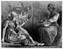 According to Hans-Jörg Uther, the main feature of tale type ATU 425A is "bribing the false bride for three nights with the husband".[12] In fact, when he developed his revision of Aarne-Thompson's system, Uther remarked that an "essential" trait of the tale type ATU 425A was the "wife's quest and gifts" and "nights bought".[13] In stories from Europe, mostly, the heroine's helpers may be three old crones, or her husband's relatives.[14]