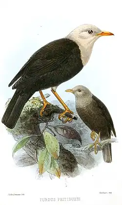 The white-headed island-thrush (Turdus pritzbueri), also known as the Loyalty island thrush,[1] is a species of passerine in the family Turdidae. It is found in Vanuatu, and New Caledonia. It was formerly considered to be a subspecies of island thrush, but was classified as a distinct species by the IOC and Clements checklist in 2024.[2][3]