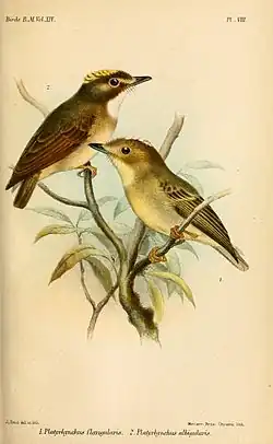 However, BirdLife International's Handbook of the Birds of the World (HBW) treats the first five subspecies as the "western white-throated spadebill" (P. albogularis) and the other nine as the "eastern white-throated spadebill" (P. mystaceus).[8] One author who advocates the two-species model calls them respectively the "white-throated" and "yellow-crested" spadebills.[9] The Clements taxonomy and the AOS partition the subspecies as the albogularis and mystaceus groups within the species.[5][6]