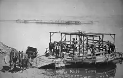 The first white settlement at White Bluffs was in 1861. The original townsite was located on the east bank of the Columbia River in Franklin County, near present-day Area 100H of the Hanford Nuclear Reservation. A ferry was built to accommodate traffic across the Columbia headed for the gold rush in British Columbia. By the early 1890s the population had grown and the town expanded to the west bank of the Columbia in Benton County.