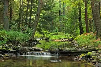The drainage basin of White Deer Creek is designated as a High-Quality Coldwater Fishery and a Migratory Fishery.[30] Wild trout naturally reproduce in the creek from its headwaters downstream to the White Deer Dam, a distance of 18.40 miles (29.61 km).[31] A total of 3.1 miles (5.0 km) of the creek (from the Union County line to Cooper Mill Road) have also been stocked with brook trout and brown trout.[32] Stocking of the stream was done as early as the 1930s.[12] Both native brook trout and brown trout inhabit the creek.[10][11]