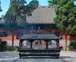 In addition, the 'Cool and Clear Terrace' known as the 'Qingliang Terrace' is behind the main hall, the place where the original sutras were translated.[1][6] This terrace is amidst bamboo forest of old pine trees and has halls which are interconnected. Four sides of the terrace are piled with green bricks. The central building of the terrace is the Vairocana Pavilion, which was originally constructed during the Han dynasty. The present building dates back to the Ming dynasty and was built with a xieshan style roof with double eaves. The pavilion principally enshrines statues of Vairocana Buddha and the Bodhisattvas Manjushri and Samantabhadra. In addition, a total of 5,050 wood-carved Buddha statues, made with incense ash, are enshrined on both sides of the pavilion. The terrace also has the Kunlu Pavilion with halls on its east and west that house the statues of the two eminent monks, She Moteng and Zhu Falan. They were buried inside the temple gate after they died here; the Bell Tower and the Drum Tower, in front of their tombs, were once prominent sights of Luo Yang City.[6]