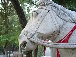 The temple faces south and is aligned along a central axis starting from the entrance gate followed by several halls and courtyards in succession.[6] The temple compound covers an area of 200 mu (13 hectares (32 acres)) and faces south. A stone paifang (archway), a three-door covered archway, has been recently built, 150 metres (490 ft) in front of the original gate. The stone horses at the front of the temple are in the Ming architectural style, representing the white horses which carried the scriptures and the Indian monks to China. Between the archway and gate lies a pool with fountains, crossed by three stone bridges.[6][29] The two horses at the entrance gate facing each other are made of green stone dated to the Song dynasty (960–1279).[6]