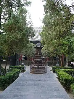 In the Main Hall, at the altar, there are three statues, the central statue is that of Sakhyamuni Buddha flanked by statue of Manjushri and Samantabhadra. There is a very large bell weighing more than 1 tonne (a figure of 2.5 tonnes is also mentioned), installed during the reign of the Jiajing Emperor of the Ming dynasty, near the altar, which is struck in time during the chanting of prayers by the monks. A community of ten thousand monks resided here during the Tang dynasty.[1][38] The inscription on the bell reads: "The sound of the Bell resounds in Buddha's temple causing the ghosts in Hell to tremble with fear."[39]