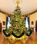 2016 | Douglas fir, Oconto, Wisconsin[51] | This Blue Room tree celebrates "We the People". It is decorated with ribbon garland featuring iconic words of the Preamble to the United States Constitution. Ornaments featured images of American families, farmers, and service members, reflecting the United States by diversity and strengthened by a shared spirit of hope and optimism.[52] | Michelle Obama | Blue Room | The Gift of the Holidays[53] |