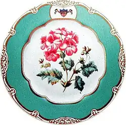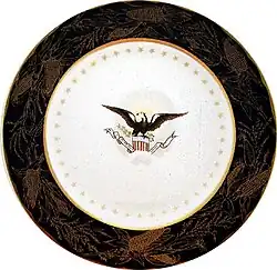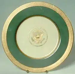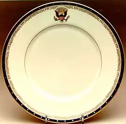 The Wilsons entered the White House in 1913, and at the time, the most recently ordered china was from the Theodore Roosevelt presidency, over ten years before.[2] By 1918, new china was needed.[2] First Lady Edith Wilson preferred ordering American-made china, and chose Lenox after viewing a sample in a Washington, D.C., store.[2] The Wilson pattern was designed by Lenox's chief designer, Frank Holmes, who chose a restrained theme.[2] The china featured a deep ivory border surrounding a brighter ivory body and two bands of matte gold encrusted with stars, stripes, and other motifs.[2] The dinner plates have deep blue borders.[3] Each of the 1,700 pieces has the presidential seal in raised gold.[2] It was the first presidential china to feature the arms of the presidential seal rather than the arms of the Great Seal of the United States.[3] The first shipment of the china was delivered to the White House between August and November 1918.[2] A New York newspaper wrote, "The proud day has arrived when the White House dining service [was] designed by an American artist, made at an American pottery ... and decorated by American workmen."[2] The china remained in use for the Warren Harding, Calvin Coolidge, and Herbert Hoover administrations.[2]
