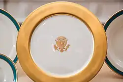 In addition to the service plate, the teacup, and the dessert plate all feature the presidential coat of arms.[5]