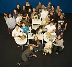 Fourteen dogs and the goat were provided and trained by Talented Animals, with head trainer Lauren Henry; all of the dogs were from animal rescue shelters.[2][5] Part of the requirement of the band was that the shot had to be performed in a single take, a feat that Roland Sonnenburg, a spokesperson for Talented Animals, said was "not bloody likely" to happen.[6] Each dog was paired with the trainer they worked best with to prevent one dog from taking the wrong direction.[2]