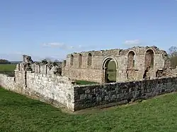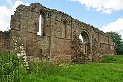 The church building was a simple cruciform, sandstone structure, with a nave of five bays, and a chancel of three bays. The transepts were small and without chapels.[50] Today, the lay-out of the building is still easy to discern, although little remains of either transept, and only the north wall of the nave and chancel is fairly intact.[16] There is a fine, round-headed Romanesque arch leading into the north transept, through which the residents would have passed to reach the cloister and the monastery. The windows on the north side are largely intact, making it easy to identify the bays of both nave and chancel. The south wall would have been windowed in the same way. It seems that the stone for the church was obtained locally – perhaps even in a field adjacent to the site, as one of the fish ponds seems to have been created from a quarry scoop.[1]