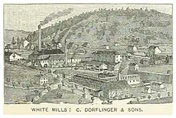 ![]() A 2008 view of White Mills Road, showing the Dorflinger factory office and factory at the right. The Dorflinger buildings have now been restored. | |