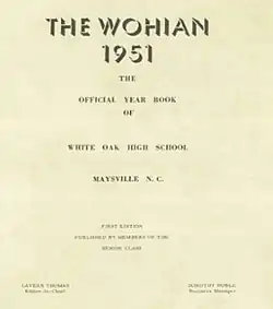 From 1927 to 1950, the school was without an official annual or yearbook. During the 1950–51 school year, under the leadership of teacher Mrs. Clyde Morton Ward, the first yearbook was published. The first edition was called "The WOHIAN".[4]