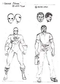 When the decision to make the White Tiger the main character of Deadly Hands of Kung Fu, with the Sons of the Tigers as supporting characters, Bill Mantlo intended to adequately depict the "gritty/city slums" of New York City.[4] Believing that, due to being Puerto Rican, George Pérez had "intimate knowledge" of the daily life in the South Bronx during the 1970s, he approached the artist with a proposal to create a "character that reflects that grim reality".[4] Due to the monochromatic style of Deadly Hands of Kung Fu, the initial concept for White Tiger's costume was simply Spider-Man's suit "without any detail".[4] With this idea, Pérez designed the visual aspect of the character, to the satisfaction of both as it was considered elegant and worked well within the constraints of the palette.[4]
