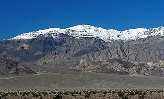 White Top Mountain is part of the Cottonwood Mountains which are the northern extension of the Panamint Range.[4] It is set within Death Valley National Park and the Mojave Desert. Precipitation runoff from this landform drains to Death Valley via Dry Bone Canyon. Topographic relief is significant as the summit rises 7,100 feet (2,164 meters) above the valley floor in 7.5 miles (12.1 km). The mountain is composed of Ordovician limestone, a marine sedimentary rock.[5] This mountain's toponym has been officially adopted by the United States Board on Geographic Names.[3]