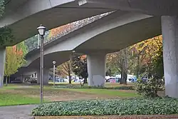 The Washington-Jefferson Street Bridge and the Chambers Connector pass through the neighborhood; as of 1990, they carried almost 100,000 cars a day.[2]