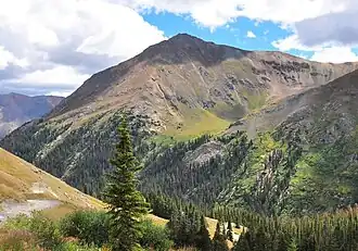 Whitecross Mountain is set six miles (9.7 km) west of the Continental Divide in the San Juan Mountains which are a subrange of the Rocky Mountains. It is located 1.36 miles (2.19 km) north-northeast of Handies Peak on land administered by the Bureau of Land Management.[4][5] Whitecross Mountain is the seventh-highest peak in the Handies Peak Wilderness Study Area.[1] Precipitation runoff from the mountain drains into the Lake Fork of the Gunnison River. Topographic relief is significant as the summit rises 2,800 feet (850 meters) above Lake Fork in 0.8 mile (1.3 km). The mountain's toponym has been officially adopted by the United States Board on Geographic Names.[3] The mountain's name is attributable to white quartzite in the shape of a cross near the summit.[6]