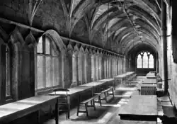 The remaining cloister walk (the eastern cloister range)[8] would have been one of four, which originally formed a continuous quadrangle.[19] The cloister which remains is relatively unchanged from how it would have been when it was constructed. The windows would originally have had no bars and looked out onto a garden or lawn.[19] Marks along one wall still remain where wooden benches and tables were affixed to it in the 19th century, when the building was a workhouse.[19]