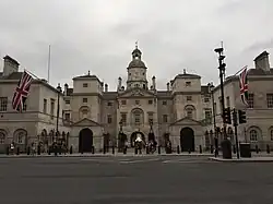 The Horse Guards building was designed by William Kent, and built during the 1750s on a former tiltyard site, replacing an earlier guard-house erected during the Civil War. The building includes an archway for coach traffic and two pedestrian arches that provide access between Whitehall and Horse Guards Parade. The central archway is marked with "SMF" and "StMW", and denotes the boundary between St Martin-in-the-Fields and St Margaret's church parish boundaries.[20]