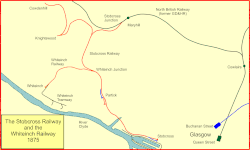 By this time the GD&HR had been taken over by the North British Railway. The creation of the new dock was obviously of fundamental concern to the company, and it secured Parliamentary authority for a line to Stobcross to serve the dock. The line, known as the Stobcross Railway, branched from the GD&HR at Maryhill (Stobcross Junction), and it opened on 20 October 1874.[3]