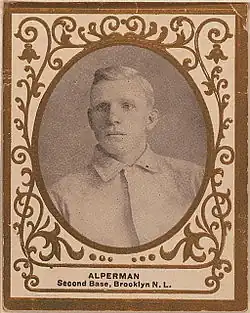 Charles Augustus "Whitey" Alperman (November 11, 1879 – December 25, 1942) was a Major League Baseball second baseman who played for the Brooklyn Superbas from 1906 to 1909.[1] In 1907, he tied for the league lead in triples. He was also in the top three in hit by pitch in 1906 and 1907. In 1909, he batted 442 times, while only receiving two walks, which is the lowest single-season walk ratio recorded in the twentieth century, of players with 300 or more plate appearances.