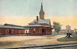 In 1881–82, the Old Colony built a brick passenger station and an engine house at South Abington. A freight yard and buildings were constructed, and a new wye with the Bridgewater Branch was added south of the station.[2][4] The station was renamed Whitman on May 10, 1886, following the town's name change a week earlier.[5][6] The Old Colony was acquired by the New York, New Haven and Hartford Railroad in 1893.[3]: 376