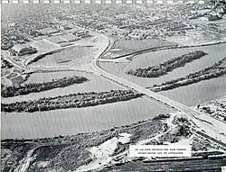 Bids for the entire $12 million construction project were solicited on May 23, 1952.[25] The Arlington, Virginia, firm of J.A. LaPorte Inc. won the dredging contract, and the D.C. firm of Morauer & Hartzell won the fill contract.[26] The work was expected to take 15 months.[26] The NCPPC approved the city's plans to connect the new bridge to Kenilworth Avenue NE on December 13, 1952,[27] and a $5.5 million plan to widen Kenwilworth Avenue into a divided, 10-lane freeway on March 24, 1953.[28] D.C. officials paid $250,000 to buy the land for the exit ramps onto Kenilworth Avenue.[29] Construction on the western approaches was blocked for a month after residents of Suitland, Maryland, (upset by loud trucks passing down their streets) won a month-long restraining order against the project so that contractors could devise and implement a noise-abatement program.[30]