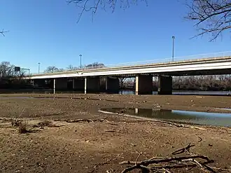 The Whitney Young Memorial Bridge is a bridge that carries East Capitol Street across the Anacostia River and Kingman Lake in Washington, D.C. in the United States. Finished in 1955, it was originally called the East Capitol Street Bridge. It was renamed for civil rights activist Whitney Young in early 1974.[3][4] The bridge is 1,800 feet (550 m) long, its six lanes are 82 feet (25 m) wide, and it has 15 spans resting on 14 piers.[5][6] It passes over the southern end of Kingman Island and is near the site of the former Robert F. Kennedy Memorial Stadium and future New Commanders Stadium.