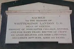 Landon was also an ordained priest in the Church of England. He was rector of the Herefordshire parish of Croft with Yarpole from 1796 until his death in 1838.[2] He added the positions of prebendary of Norwich (1811 to 1813) and of Salisbury (1821 until his death; he was vicar of the prebendary parish of Bishopstone, near Swindon from 1822 to 1826).[3] He was Dean of Exeter (1813 until his death), and vicar of Branscombe, Devon (1827 to 1830).[2]