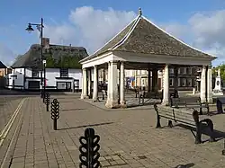 In the centre of the Market Place is the Buttercross, dating back to 1680. Originally a place for people to sell goods, the structure was considered useless in the 1800s and only saved from demolition when a local businessman donated some slate tiles for the roof. Latterly it served as a bus shelter, until the bus services were relocated from the Market Place to a purpose-built terminal in Grosvenor Road.[26]