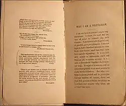 The preface for Why I Am a Vegetarian begins with an analogy of mankind's succeeding generations, in that "the human race is like a snake—it sheds. Ever and anon, as the ages bloom, old forms of thought are superseded by intellectual bran-news."[4] The following page, opposite the opening, are excerpts from several works, including the Irish novelist and poet Oliver Goldsmith's The Hermit, as well as an anonymous poem "What more advance can mortals make in sin?..." It also contains quotes from the British surgeon and polymath Sir Henry Thompson, the Scottish born geologist and natural scientist Richard Owen, and the Greek biographer and essayist Plutarch.[19]