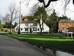 The village green is bordered by a tall white clapboard mill with working water wheel, the parish church, several houses and a public house, The Rose Inn. There was once another public house, 'The Hooden Horse', in The Street adjoining the village green, known until the 1950s as 'The Swan', this closed in 1979.