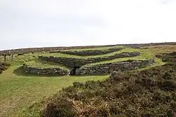 The chambered cairn is located near Kirkwall on Mainland, Orkney in Scotland. The monument is situated on a steep west facing hill northwest of Wideford Hill and faces the Bays of Firth and Kirkwall.[1] It is similar in design to the Maeshowe burial monument, also located on Mainland, Orkney. The visible masonry shows the different construction stages of the Neolithic cairn with its three concentric walls built on an earthen platform. The monument has a stepped facade, but the original shape was probably rounded or conical, with the stonework covered in clay and turf.[1][2]